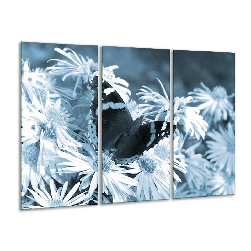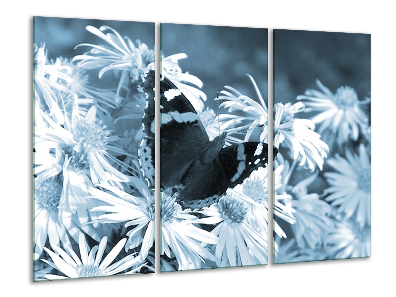 Canvas Schilderij Bloemen, Vlinder | Blauw, Grijs, Zwart | 120x80cm 3Luik