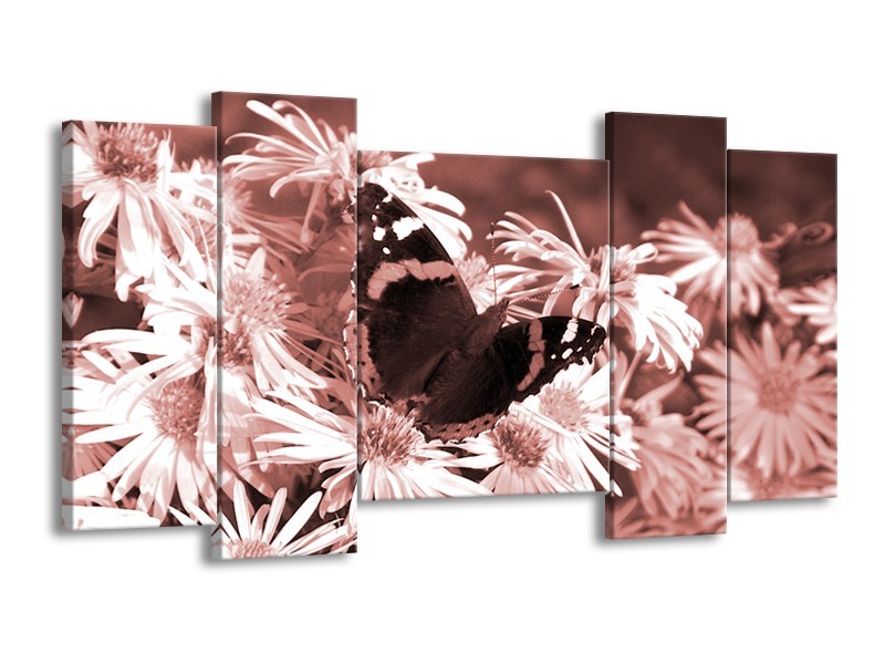 Canvas Schilderij Bloemen, Vlinder | Bruin, Rood, Zwart | 120x65cm 5Luik