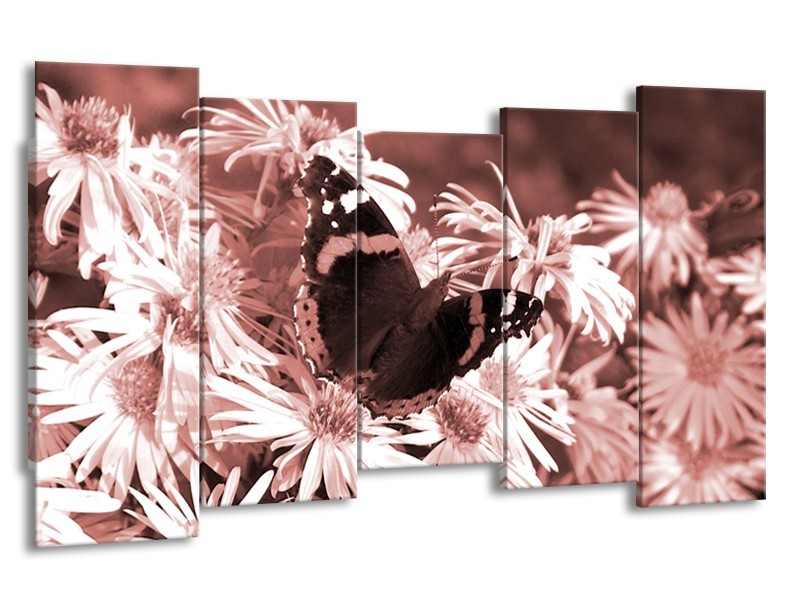 Canvas Schilderij Bloemen, Vlinder | Bruin, Rood, Zwart | 150x80cm 5Luik