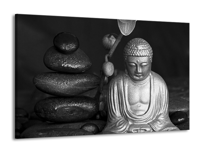Canvas Schilderij Boeddha, Stenen | Zwart, Wit, Grijs | 140x90cm 1Luik