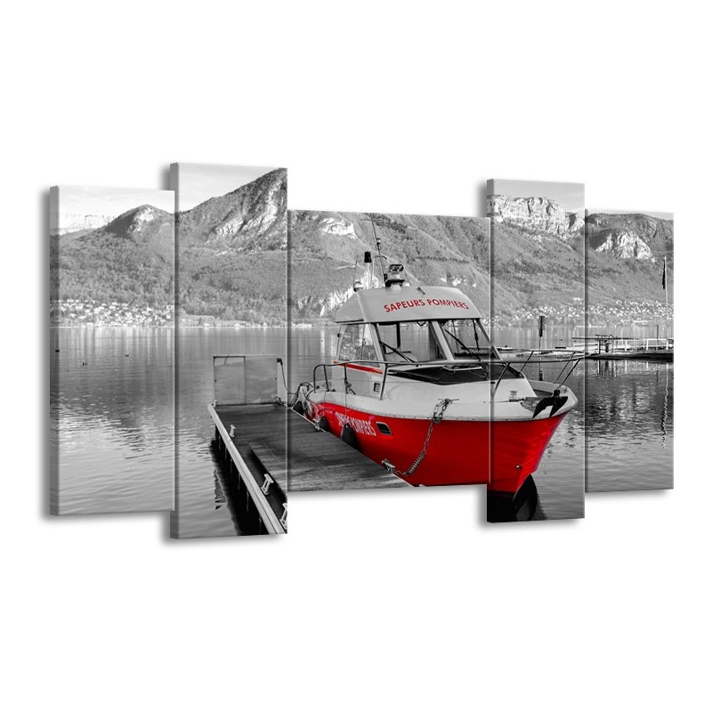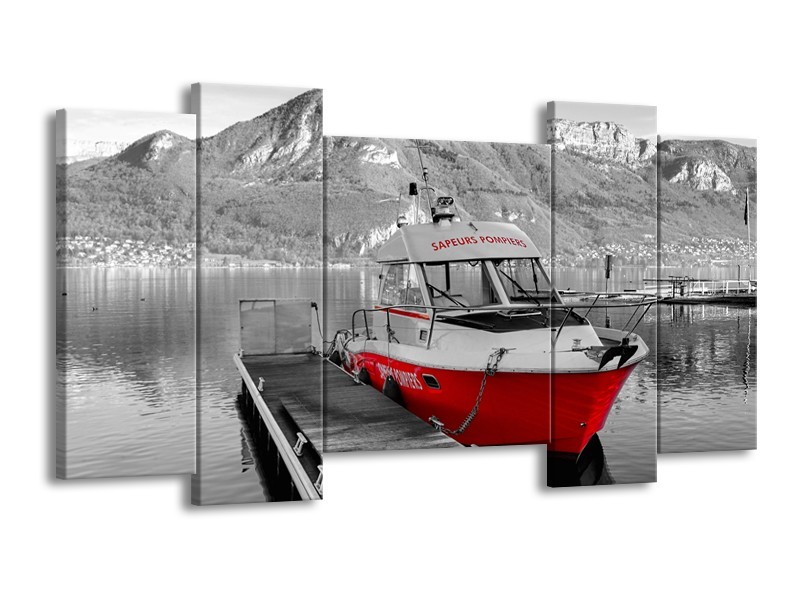 Canvas Schilderij Boot, Bergen | Zwart, Wit, Rood | 120x65cm 5Luik