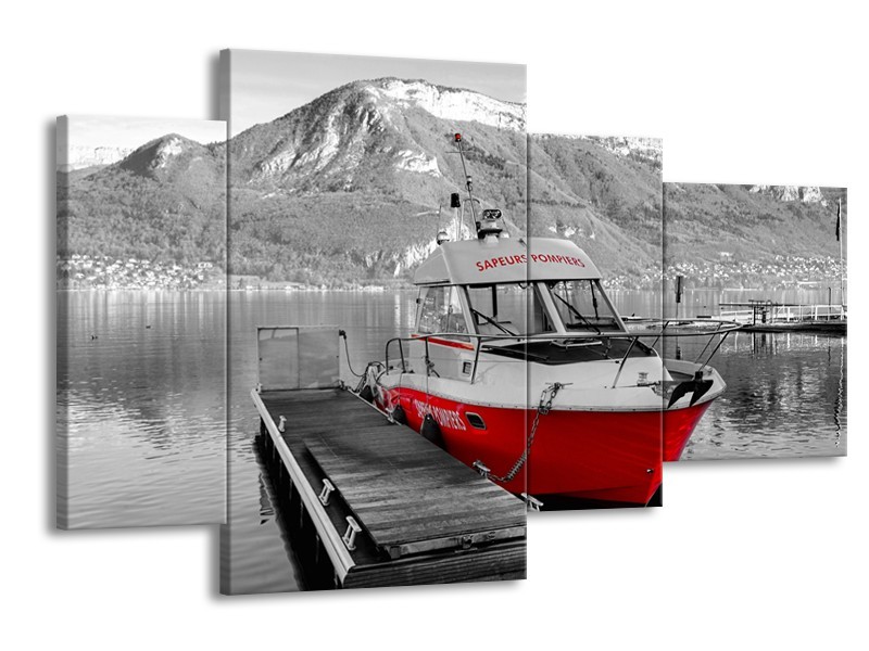 Canvas Schilderij Boot, Bergen | Zwart, Wit, Rood | 120x75cm 4Luik