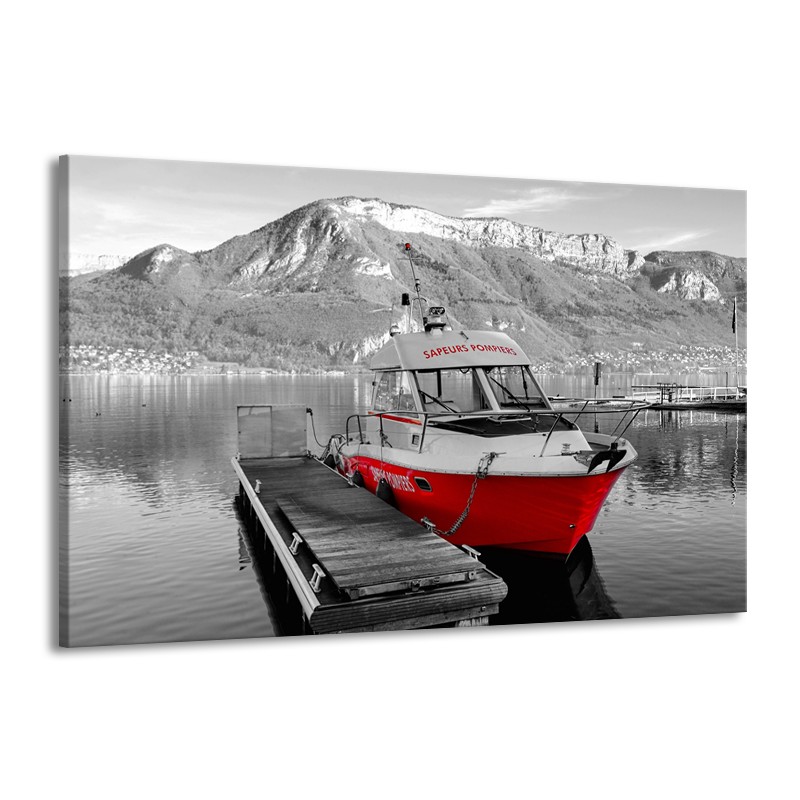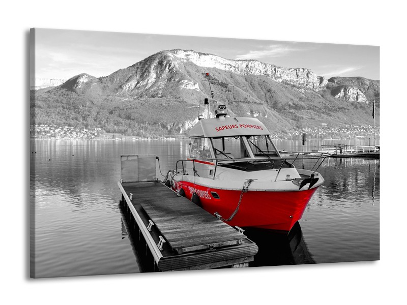 Canvas Schilderij Boot, Bergen | Zwart, Wit, Rood | 140x90cm 1Luik