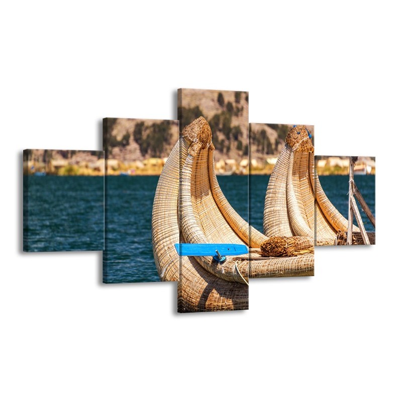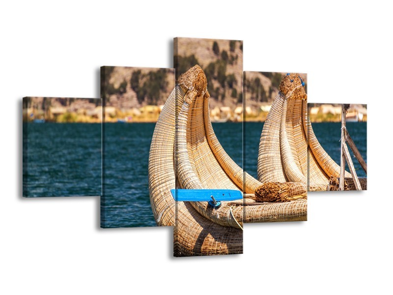 Canvas Schilderij Boot, Natuur | Geel, Bruin, Blauw | 125x70cm 5Luik