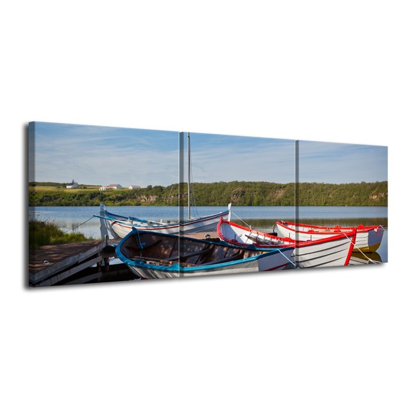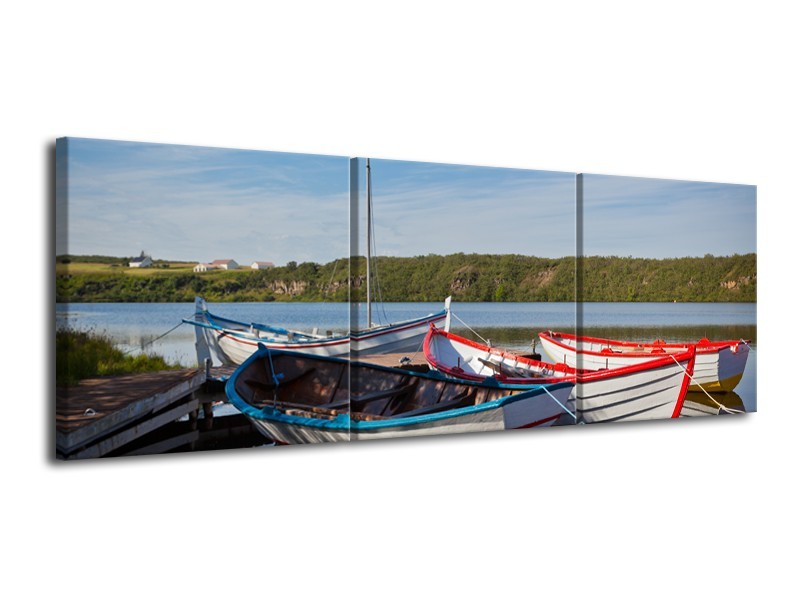 Canvas Schilderij Boot, Natuur | Grijs, Rood, Blauw | 120x40cm 3Luik