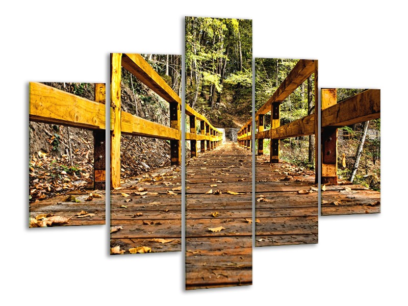 Canvas Schilderij Brug, Natuur | Bruin, Geel, Groen | 100x70cm 5Luik