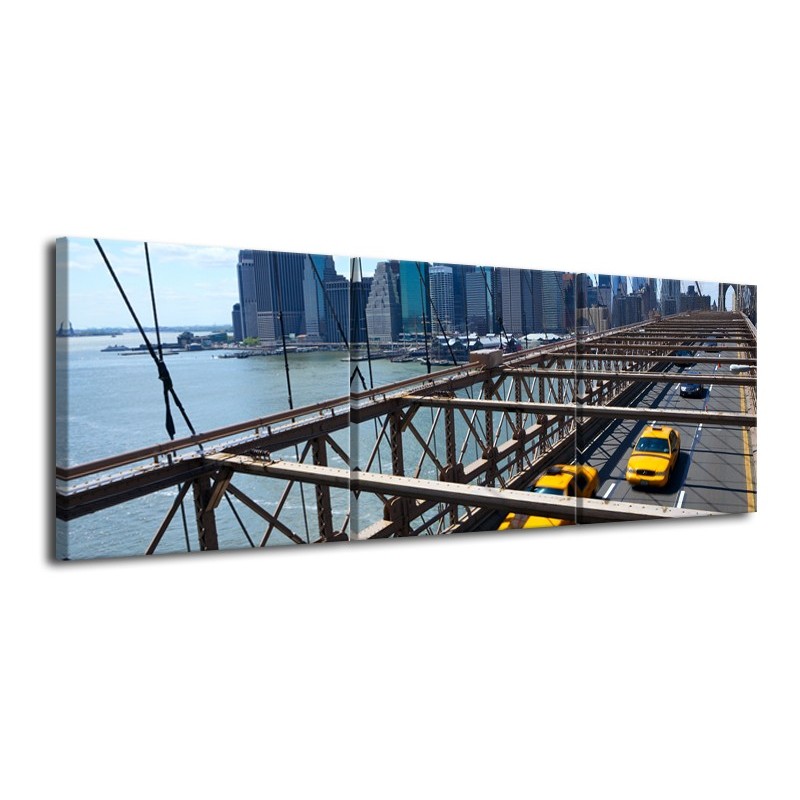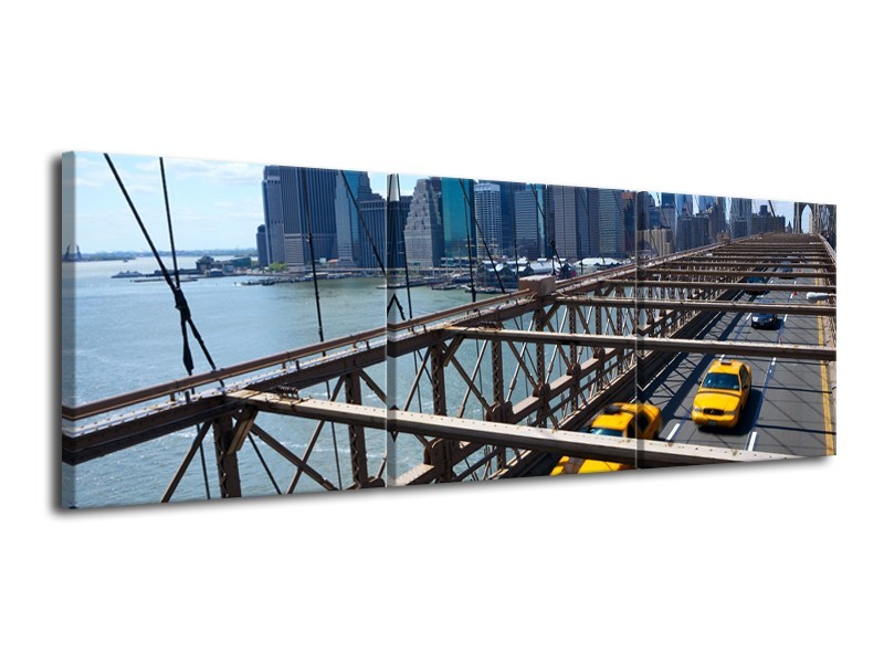 Canvas Schilderij Brug, New York | Grijs, Blauw, Geel | 120x40cm 3Luik