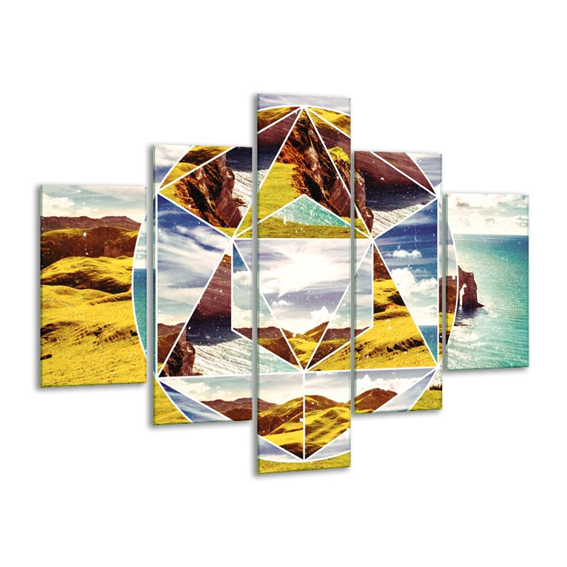 Canvas Schilderij Design | Geel, Turquoise, Bruin | 100x70cm 5Luik