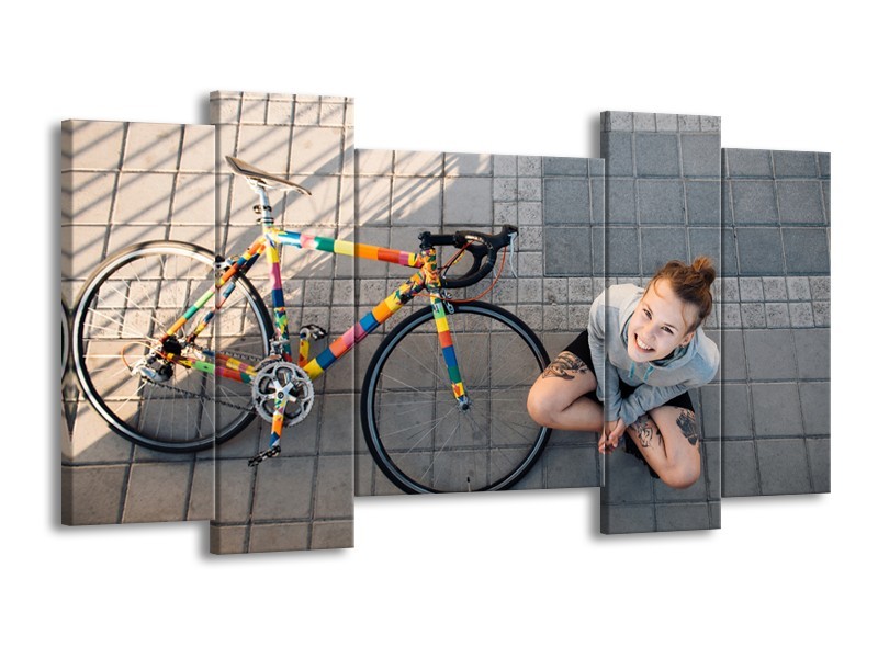Canvas Schilderij Fiets, Meid | Grijs, Geel | 120x65cm 5Luik