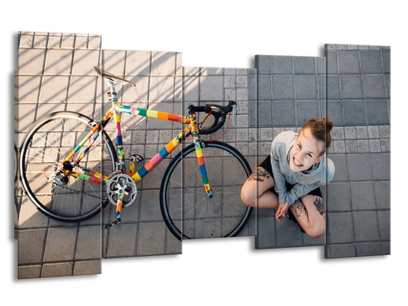 Canvas Schilderij Fiets, Meid | Grijs, Geel | 150x80cm 5Luik