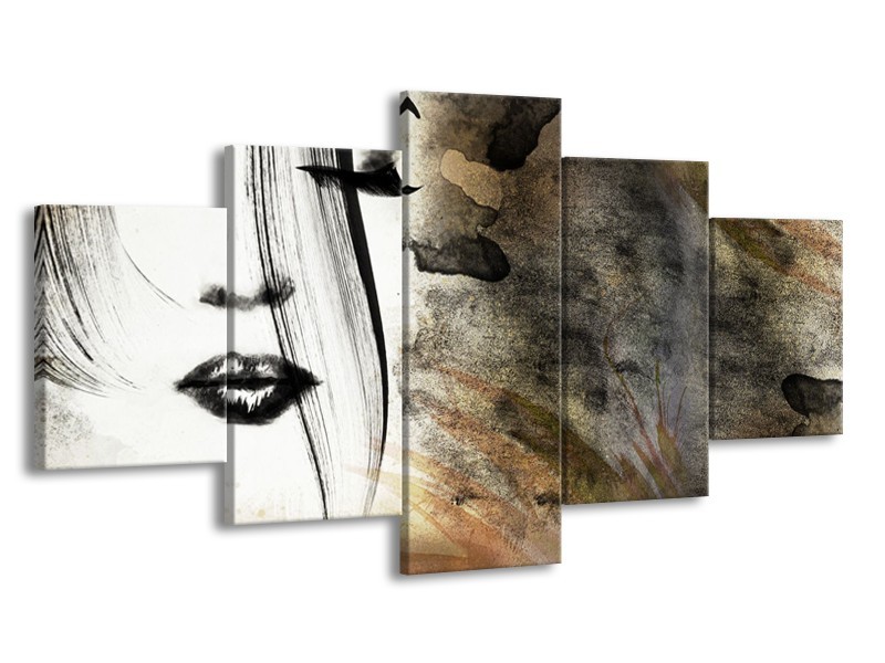Canvas Schilderij Gezicht, Vrouw | Zwart, Bruin, Wit | 150x80cm 5Luik