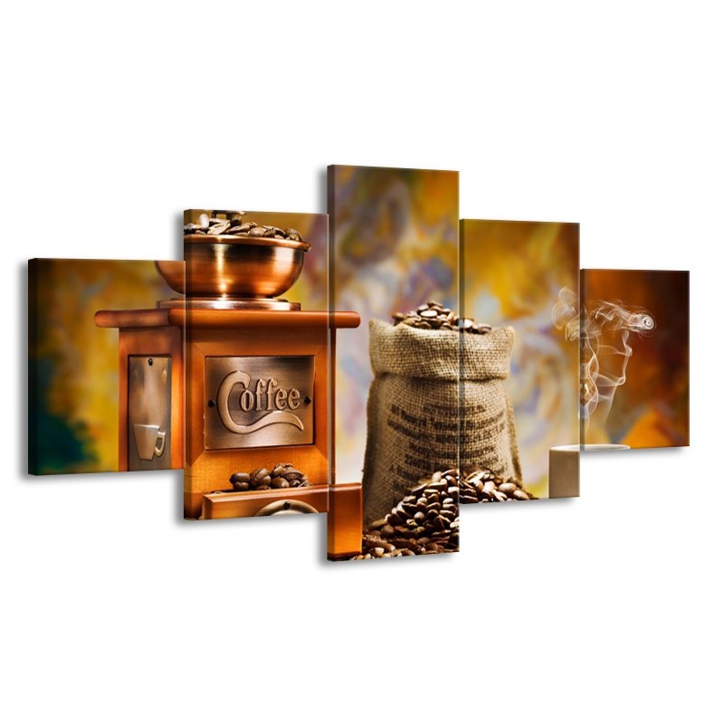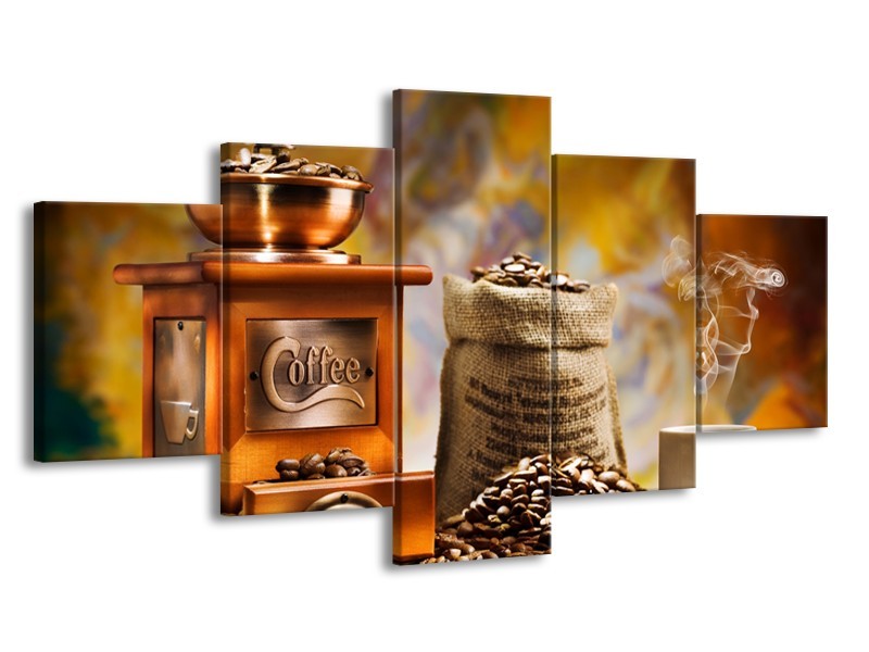Canvas Schilderij Koffie, Keuken | Bruin, Geel, Oranje | 150x80cm 5Luik