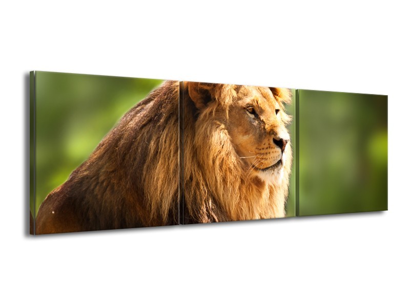 Canvas Schilderij Leeuw, Dieren | Bruin, Groen | 150x50cm 3Luik