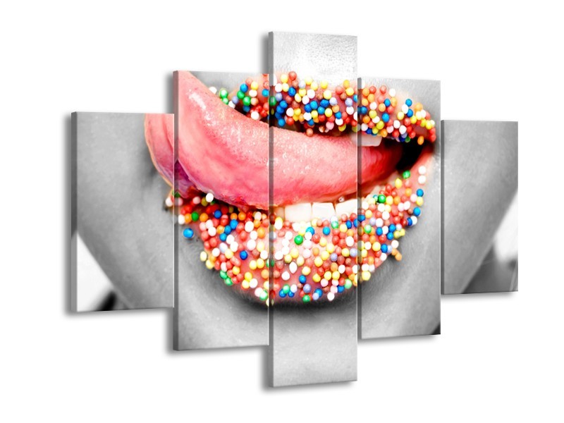 Canvas Schilderij Lippen, Tong | Grijs, Roze | 150x105cm 5Luik