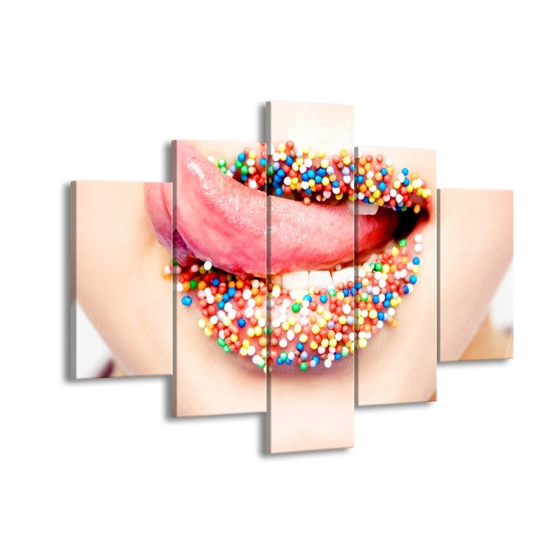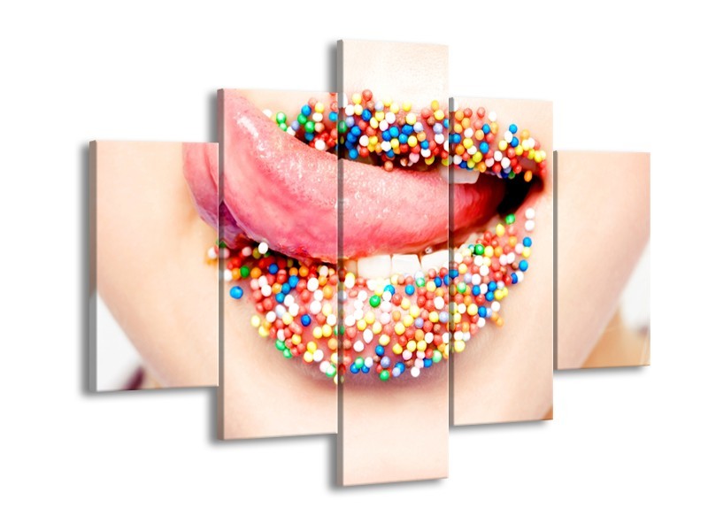 Canvas Schilderij Lippen, Tong | Roze, Crème, Blauw | 150x105cm 5Luik