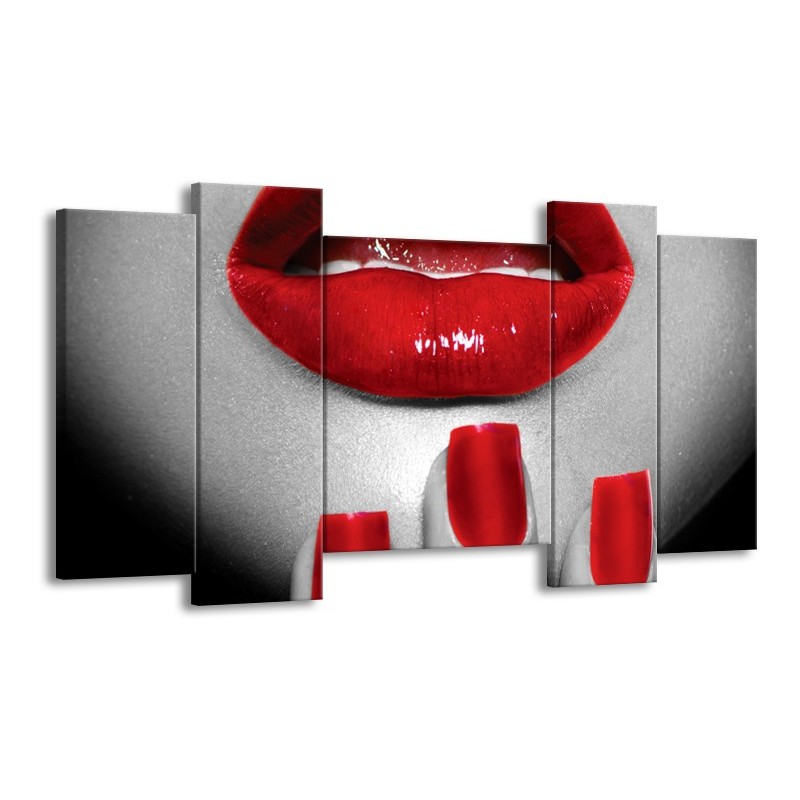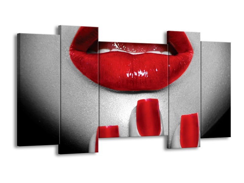 Canvas Schilderij Lippen, Vrouw | Grijs, Rood | 120x65cm 5Luik