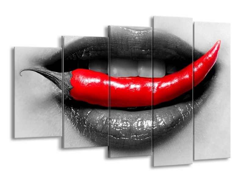 Canvas Schilderij Lippen, Vrouw | Grijs, Rood | 150x100cm 5Luik
