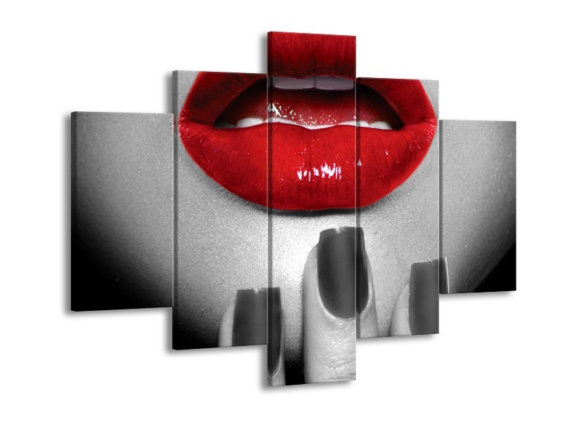Canvas Schilderij Lippen, Vrouw | Grijs, Rood | 150x105cm 5Luik