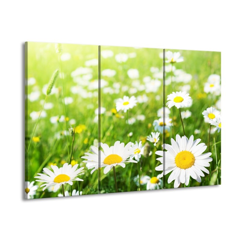 Canvas Schilderij Madeliefje, Bloemen | Groen, Wit, Geel | 60x90cm 3Luik