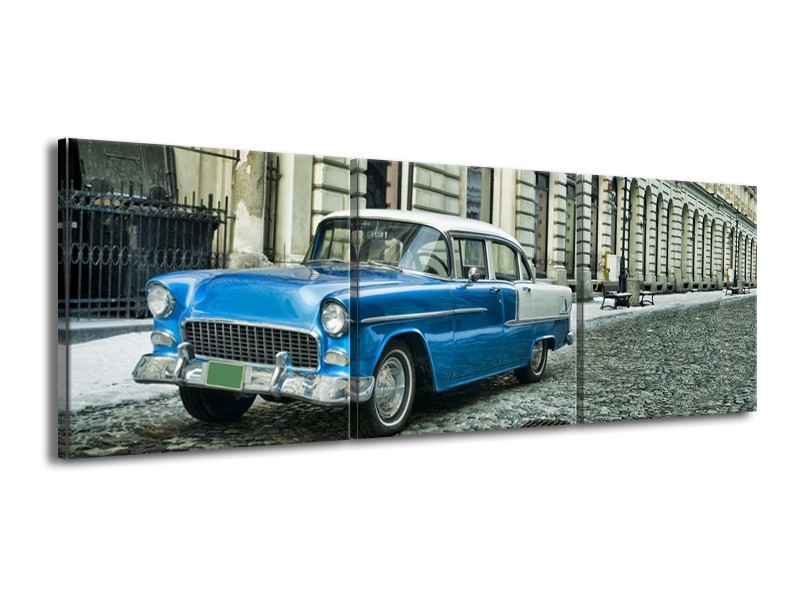 Canvas Schilderij Oldtimer, Auto | Blauw, Groen, Grijs | 150x50cm 3Luik