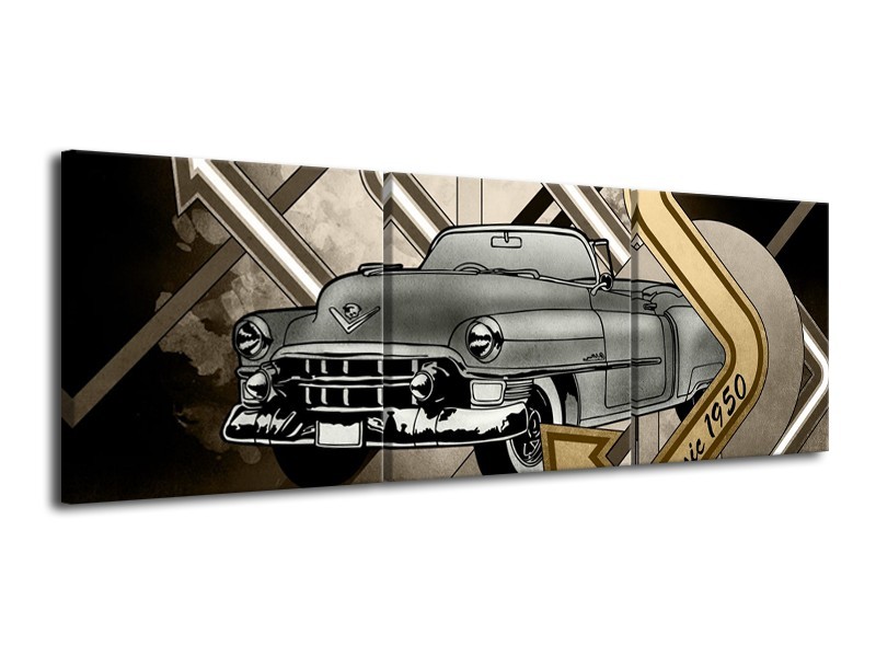 Canvas Schilderij Oldtimer, Auto | Grijs, Goud | 120x40cm 3Luik