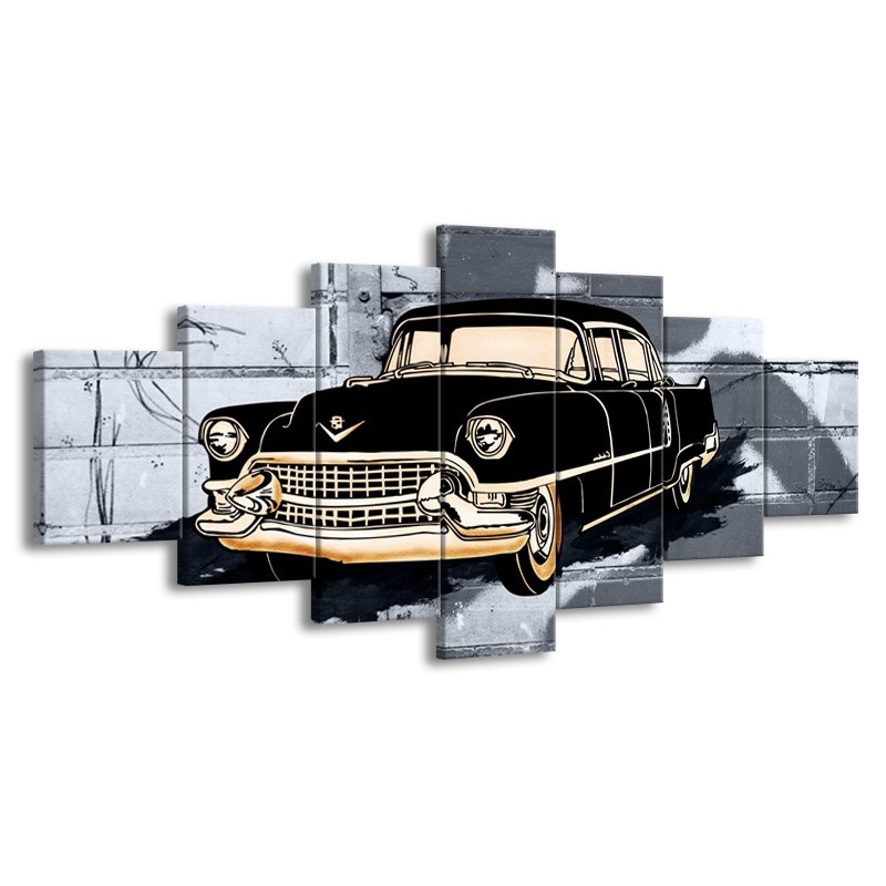 Canvas Schilderij Oldtimer, Auto | Grijs, Zwart, Geel | 210x100cm 7Luik