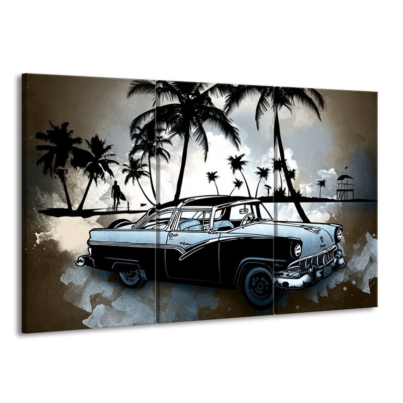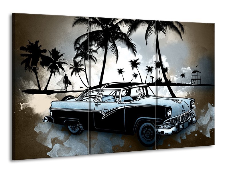 Canvas Schilderij Oldtimer, Auto | Zwart, Wit, Blauw | 165x100cm 3Luik