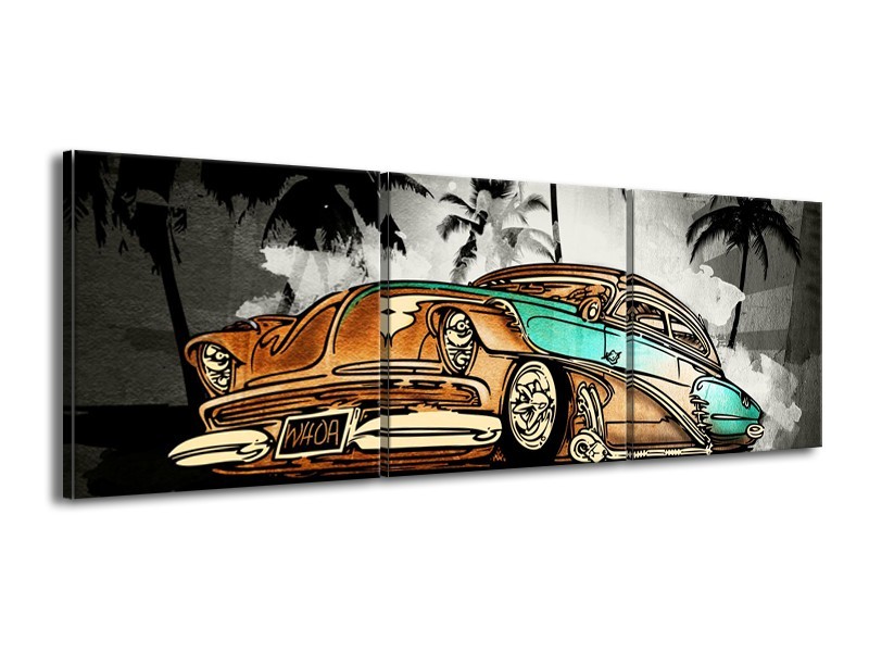 Canvas Schilderij Oldtimer, Auto | Zwart, Wit, Oranje | 150x50cm 3Luik
