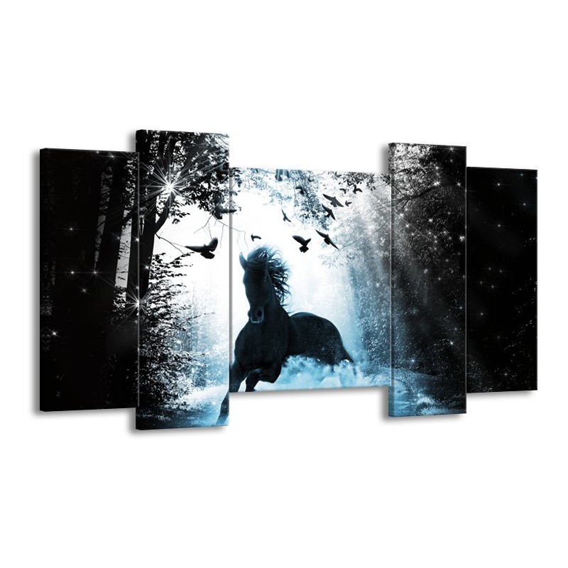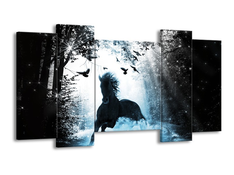 Canvas Schilderij Paard, Dieren | Blauw, Zwart, Wit | 120x65cm 5Luik