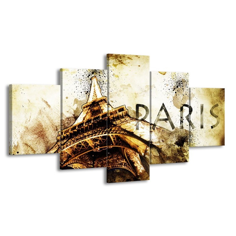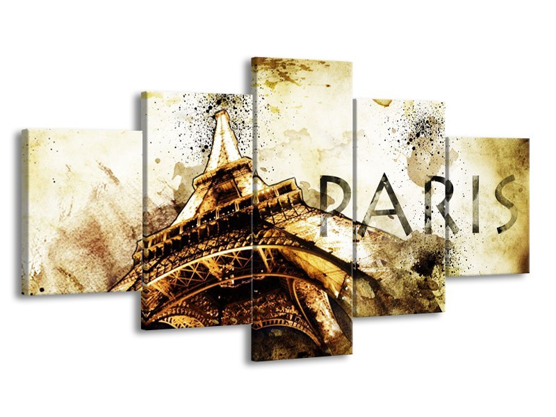 Canvas Schilderij Parijs, Eiffeltoren | Bruin, Zwart, Geel | 150x80cm 5Luik