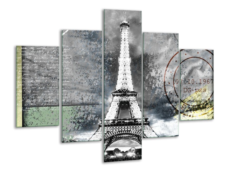 Canvas Schilderij Parijs, Eiffeltoren | Grijs, Crème, Groen | 100x70cm 5Luik