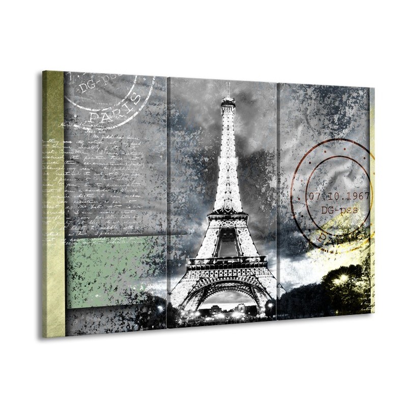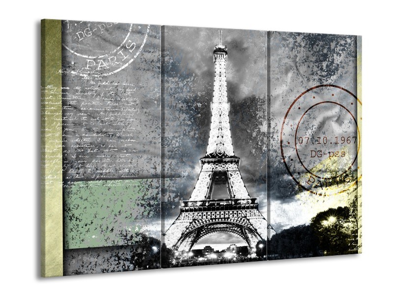 Canvas Schilderij Parijs, Eiffeltoren | Grijs, Crème, Groen | 60x90cm 3Luik