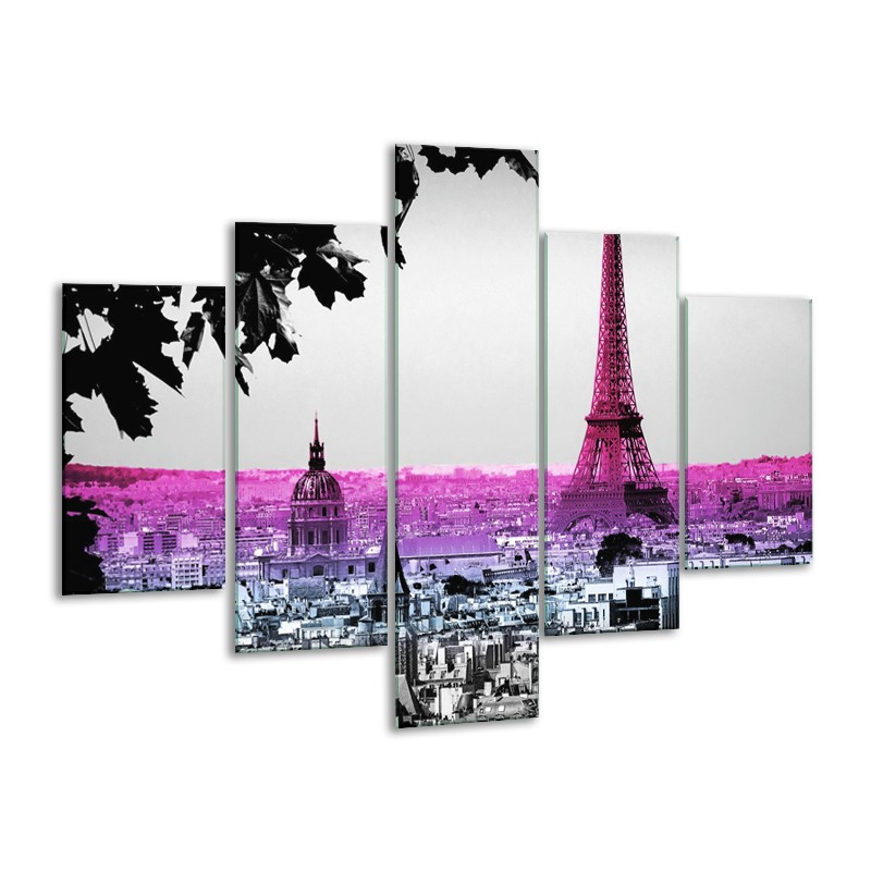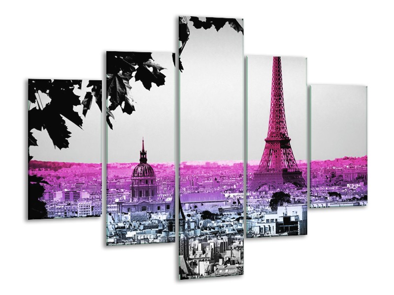 Canvas Schilderij Parijs, Eiffeltoren | Paars, Roze, Grijs | 100x70cm 5Luik
