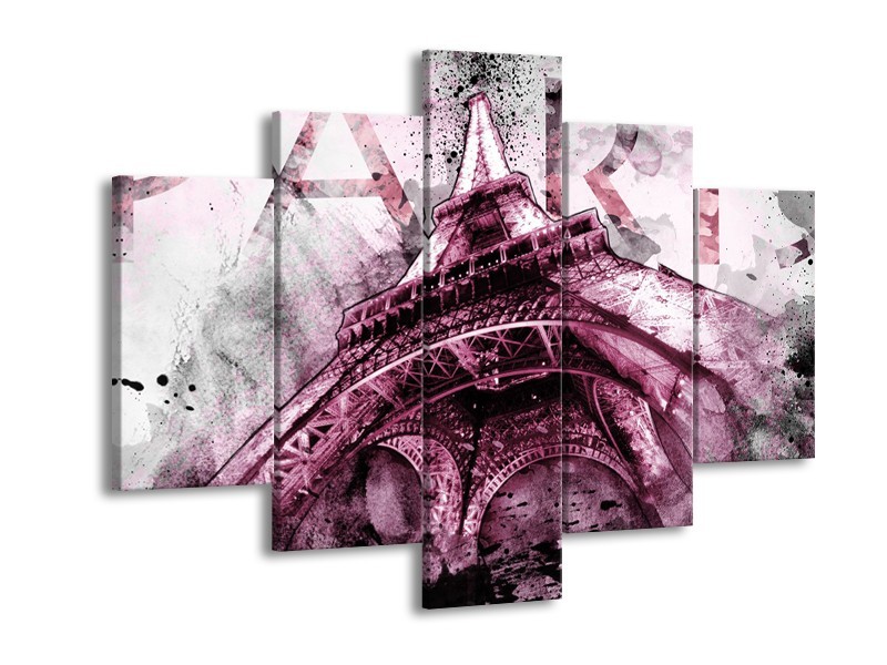 Canvas Schilderij Parijs, Eiffeltoren | Paars, Roze, Grijs | 150x105cm 5Luik