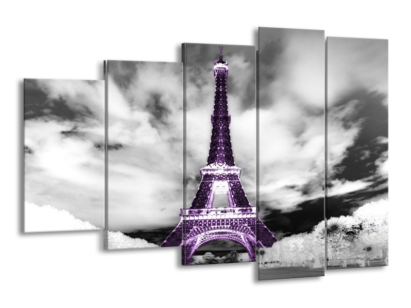 Canvas Schilderij Parijs, Eiffeltoren | Zwart, Wit, Paars | 150x100cm 5Luik