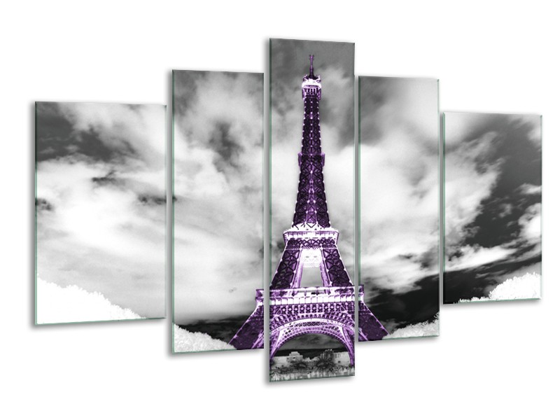 Canvas Schilderij Parijs, Eiffeltoren | Zwart, Wit, Paars | 170x100cm 5Luik