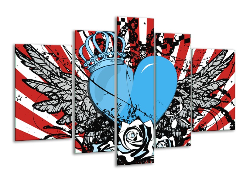 Canvas Schilderij Popart, Hart | Blauw, Rood, Zwart | 170x100cm 5Luik