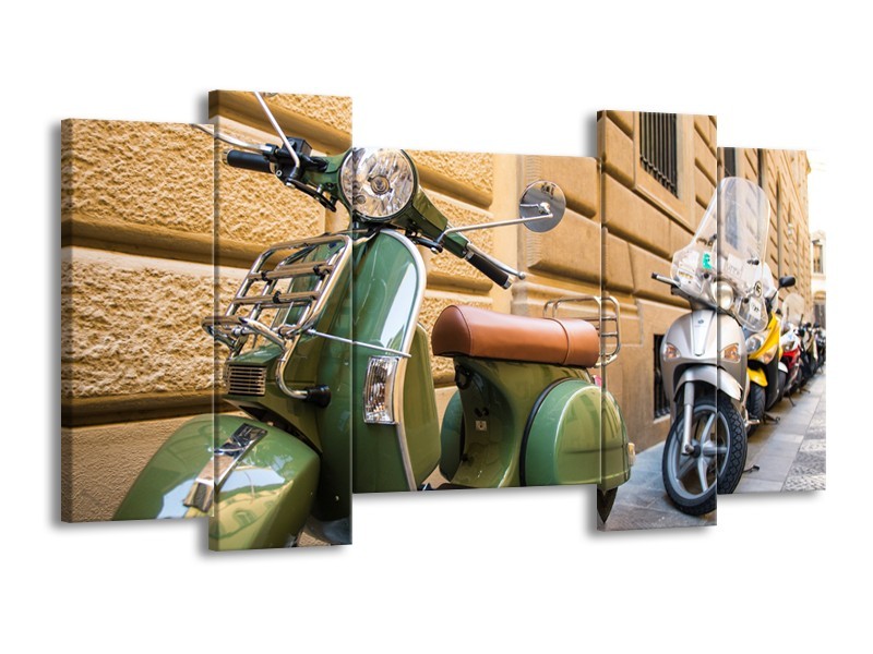 Canvas Schilderij Scooter, Motor | Groen, Bruin, Crème | 120x65cm 5Luik