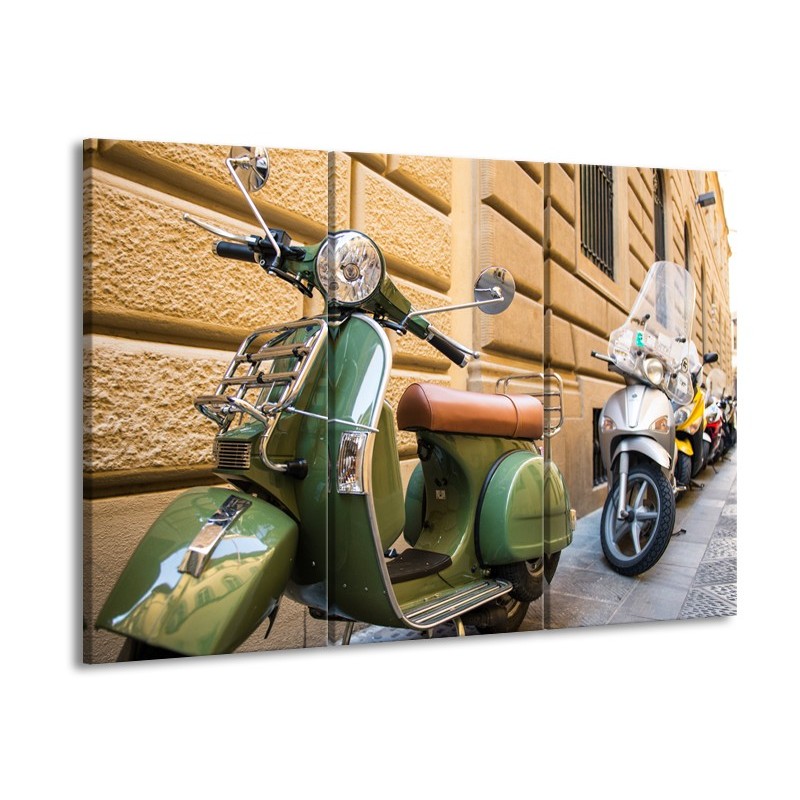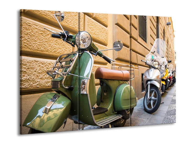 Canvas Schilderij Scooter, Motor | Groen, Bruin, Crème | 60x90cm 3Luik