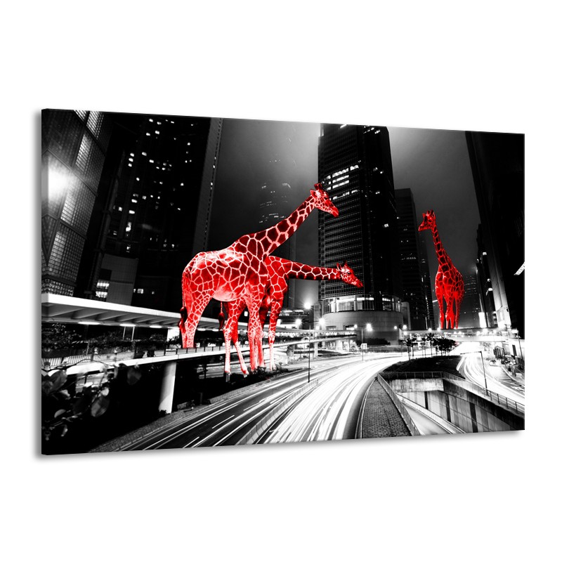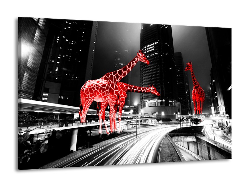 Canvas Schilderij Steden, Giraffe | Zwart, Wit, Rood | 140x90cm 1Luik