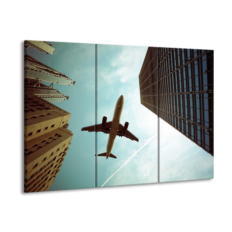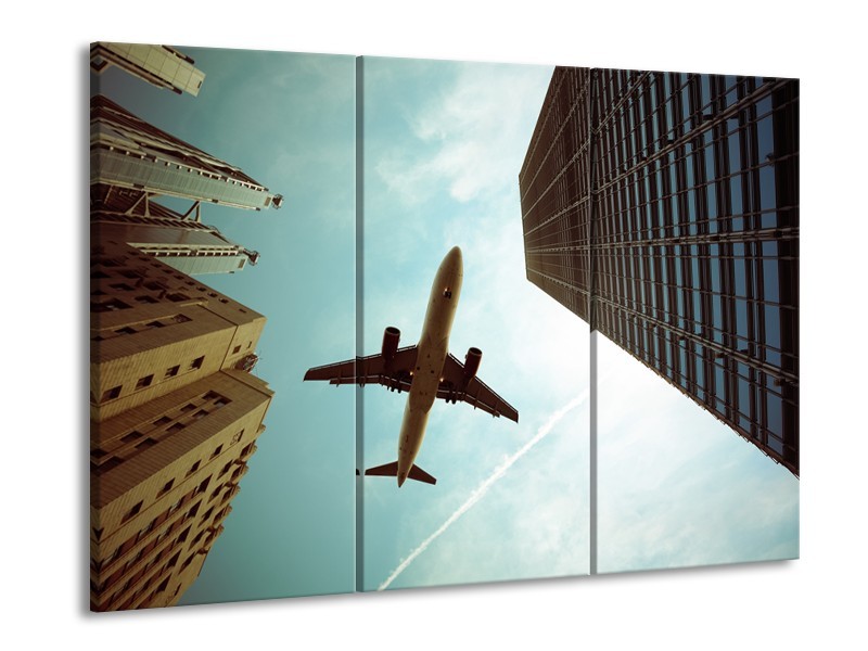 Canvas Schilderij Steden, Vliegtuig | Groen, Blauw, Grijs | 60x90cm 3Luik