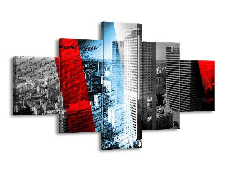 Canvas Schilderij Steden, Wolkenkrabber | Zwart, Blauw, Rood | 125x70cm 5Luik