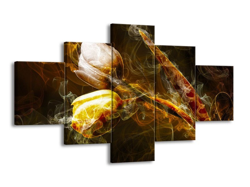 Canvas Schilderij Tulpen, Bloemen | Bruin, Goud, Geel | 125x70cm 5Luik