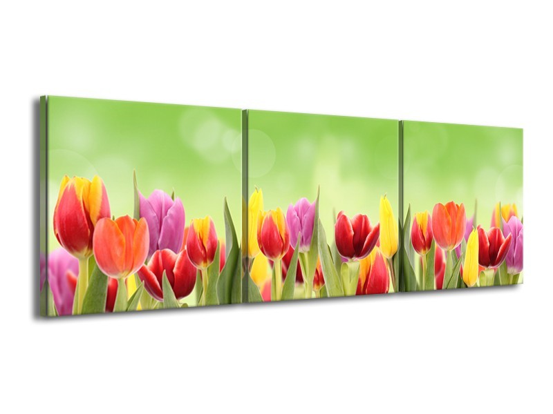Canvas Schilderij Tulpen, Bloemen | Groen, Rood, Geel | 150x50cm 3Luik