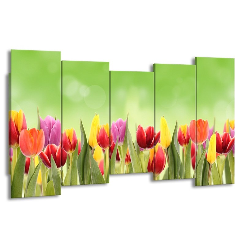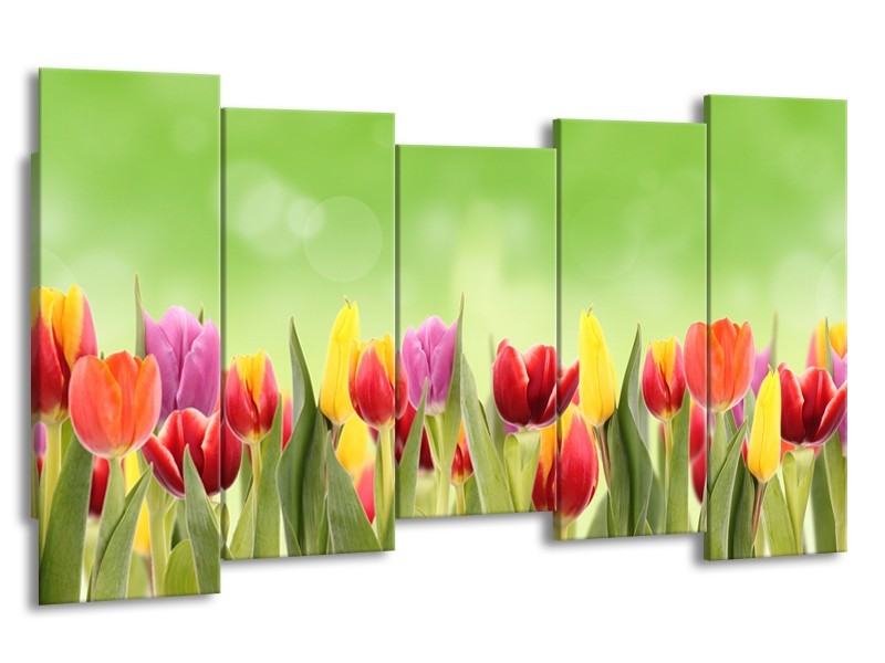 Canvas Schilderij Tulpen, Bloemen | Groen, Rood, Geel | 150x80cm 5Luik