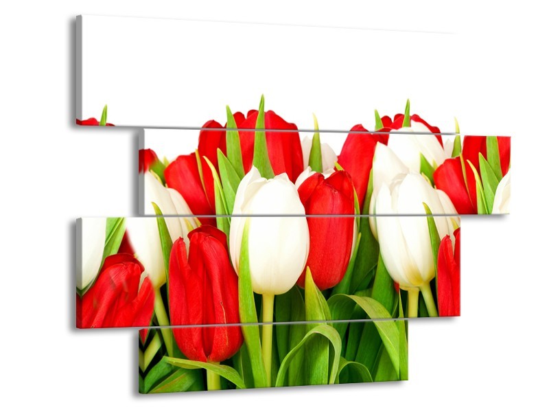 Canvas Schilderij Tulpen, Bloemen | Rood, Wit, Groen | 115x85cm 4Luik