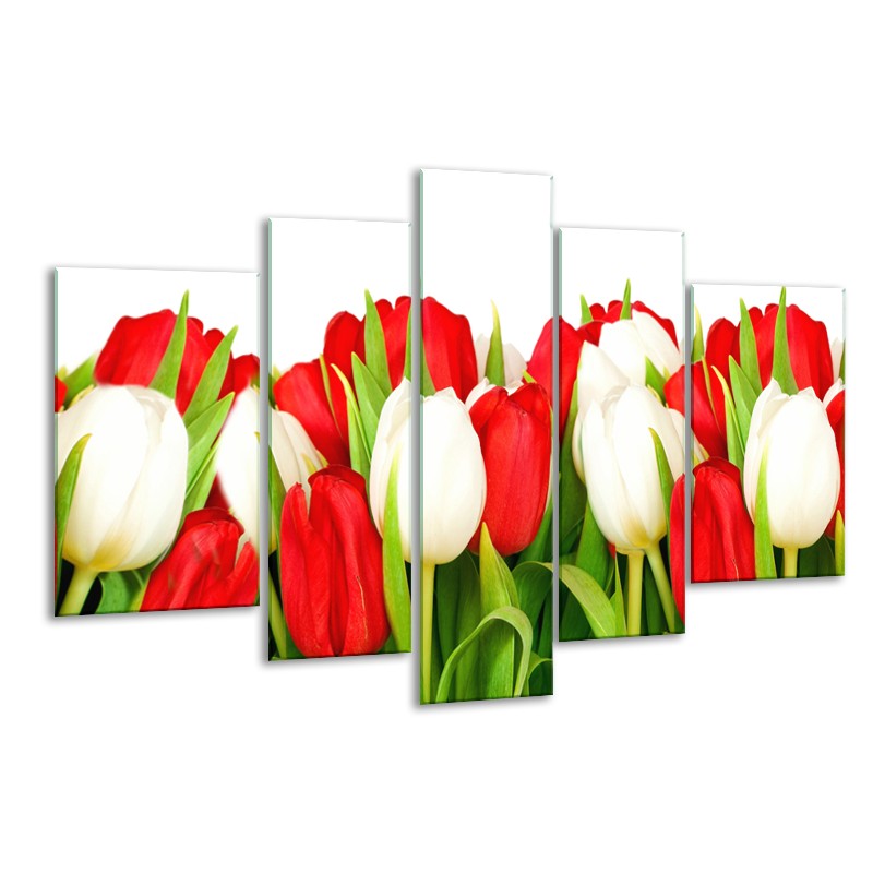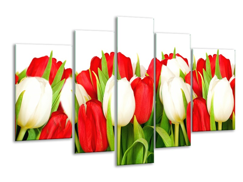 Canvas Schilderij Tulpen, Bloemen | Rood, Wit, Groen | 170x100cm 5Luik