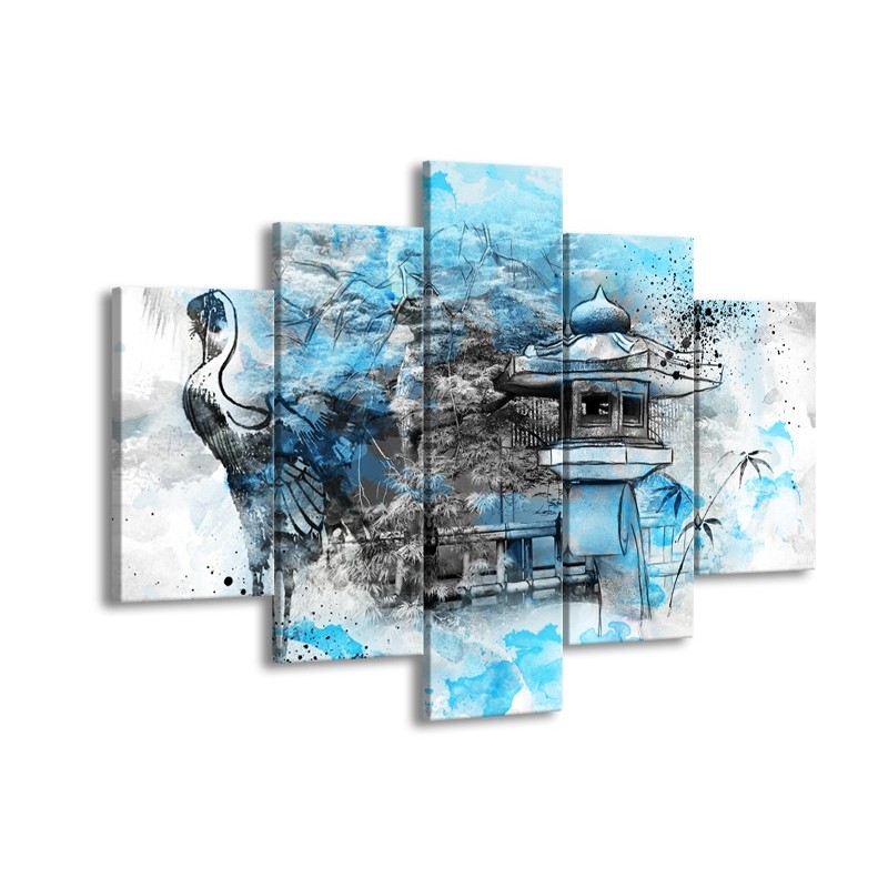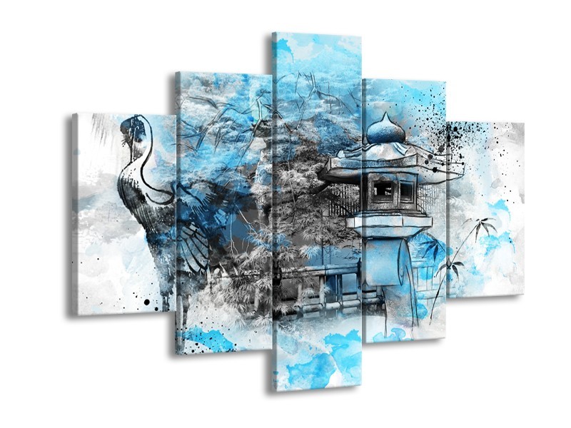 Canvas Schilderij Vogel, Chinese gebouw | Blauw, Zwart, Wit | 150x105cm 5Luik