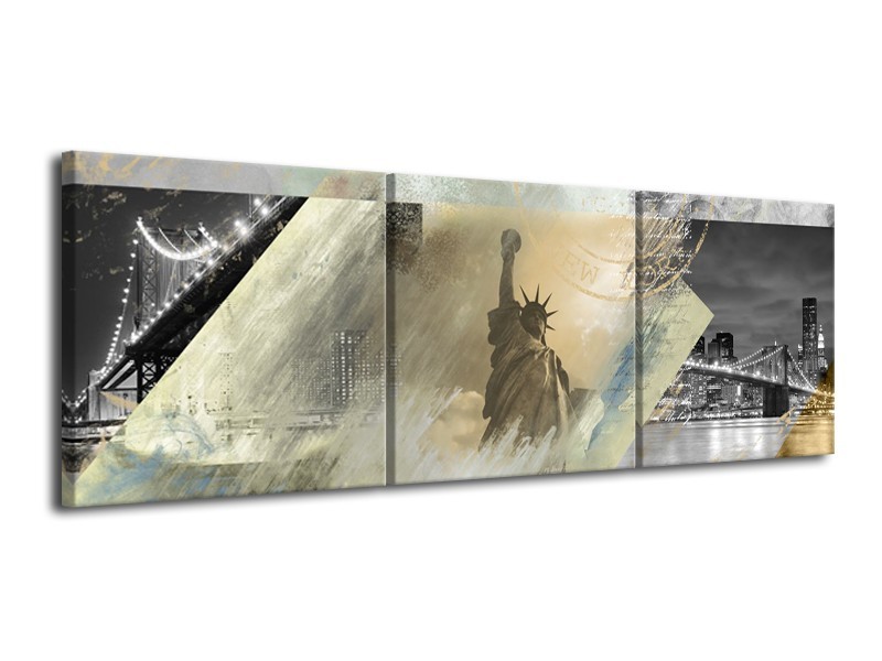 Canvas Schilderij Vrijheidsbeeld, New York | Grijs, Crème, Groen | 120x40cm 3Luik