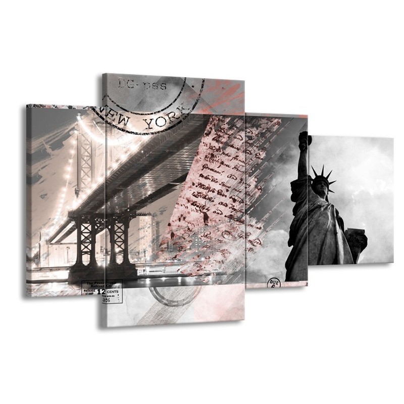 Canvas Schilderij Vrijheidsbeeld, New York | Grijs, Rood, Zwart, Wit | 120x75cm 4Luik